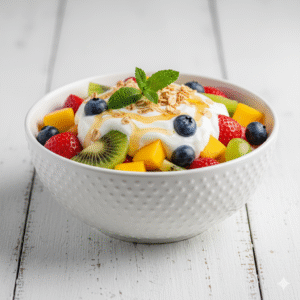 • Ingredients: Fresh fruits, curd, honey, and dry fruits.